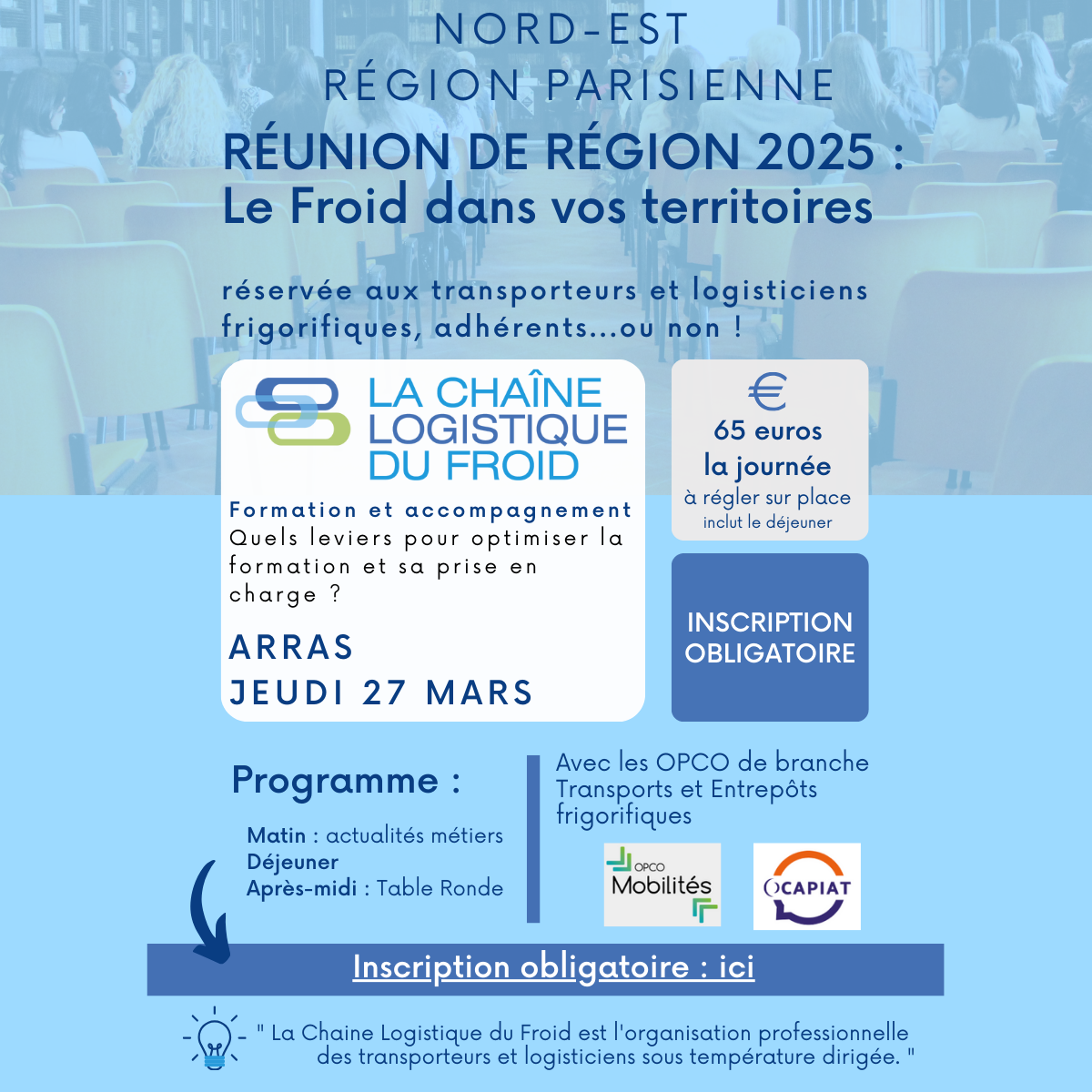 Les inscriptions sont toujours ouvertes pour venir partager votre vision de la conjoncture en région Nord-Est - Région Parisienne et rencontrer les OPCO de branche Transports et Entrepôts frigorifiques pour échanger sur leurs offres de services ainsi que sur les opportunités nationales et locales en matière d'actualités de financements de la formation.